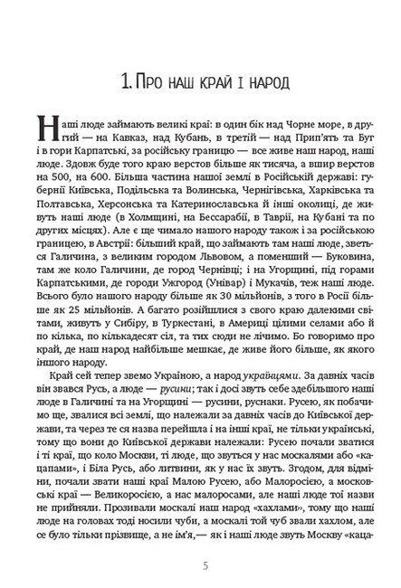 У цій унікальній книжці, написаній видатним українським ученим, письменником і політичним діячем Михайлом Грушевським, стисло і доступно, надзвичайно колоритною мовою розповідається про невмирущі сторінки нашого героїчного минулого, про споконвічні устремління українського народу до волі та справедливості, про тернистий шлях до незалежності.