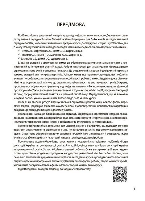 Посібник містить 64 дидактичні картки до курсу «Досліджуємо історію і суспільство. 6 клас», призначених для поточного формувального експрес-оцінювання знань учнів на різних етапах уроку, зокрема на етапі актуалізації чи закріплення знань. Може бути використаний під основні теми різних модельних програм (автори: Гісем О. В., Мартинюк О. О. та ін.; Васильків І. Д., Димій І. С та ін.; Пометун О. І., Ремех Т. О. та ін.).