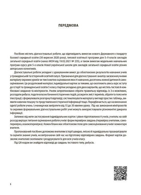 Посібник містить систему завдань, призначених для діагностування та оцінювання якості навчання, досягнень кожної дитини й самооцінювання учнів 5-го класу з тем курсу відповідно до вимог нового Державного стандарту базової загальної середньої освіти, Типової освітньої програми для 5–9 класів закладів загальної середньої освіти (наказ МОН від 19.02.2021 № 235), змісту чинних модельних навчальних програм курсу для закладів загальної середньої освіти, рекомендованих Міністерством освіти і науки України (наказ МОН від 12.07.2021 № 795).