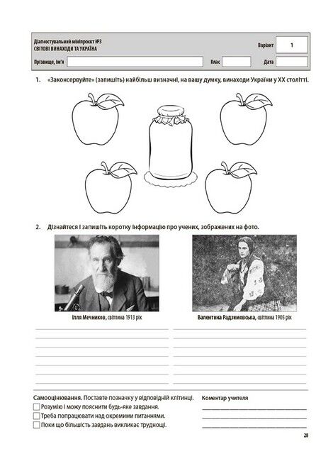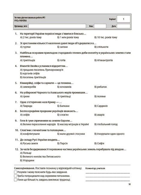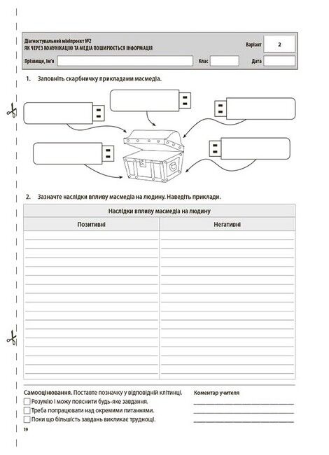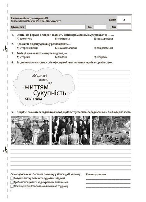 Усі роботи розміщено на окремих аркушах зручного формату (за варіантами), наприкінці яких відведене місце для самооцінювання здобувачів освіти та коментаря вчителя.