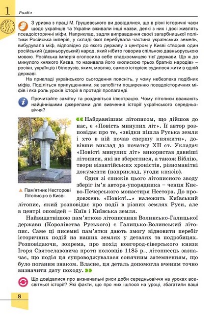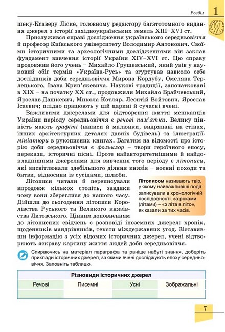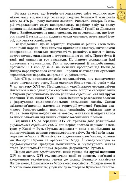 Підручник створено відповідно до модельної навчальної програми «Історія. 7–9 класи» для ЗЗСО (авт.: Бурлака О. В., Желіба О. В., Павловська-Кравчук В. А., Худобець О. А., Черкас Б. В., Щупак І. Я.) і спрямовано на вивчення історії українського середньовіччя, розуміння його значущості й внеску в світову політичну та культурну спадщину. Він має чітку структуру, містить достатню кількість навчального матеріалу, а також різноманітні вправи, що в комплексі забезпечує розвиток історико-хронологічного, геопросторового, критичного та системного мислення, формує наскрізні вміння і розвиває творчі здібності. Обсяг і складність пропонованого в підручнику навчального матеріалу є оптимальними і відповідають можливостям засвоєння його учнями на належному рівні, що дає змогу досягти визначені програмою очікувані результати навчання.