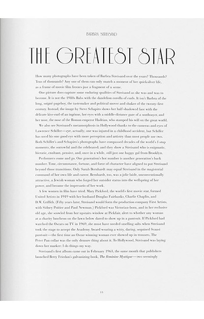Ця фотокнига — інтимна розмова з Барброю Стрейзанд, яку ведуть двоє великих майстрів: Стів Шапіро та Лоуренс Шиллер. Їхні світлини зберігають не лише ідеальний ракурс і світло, а й енергію жінки, що перетворила власну індивідуальність на еталон. На сторінках — студійні портрети, бекстейдж зі зйомок, моменти тиші між піснею і кадром, коли голос легенди чути очима.