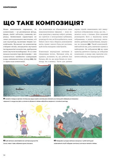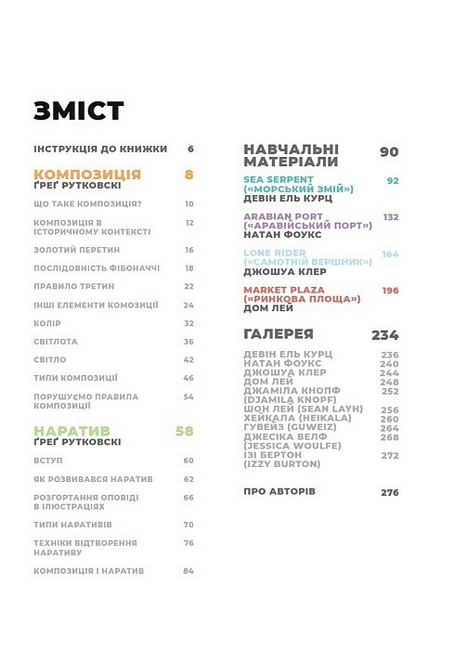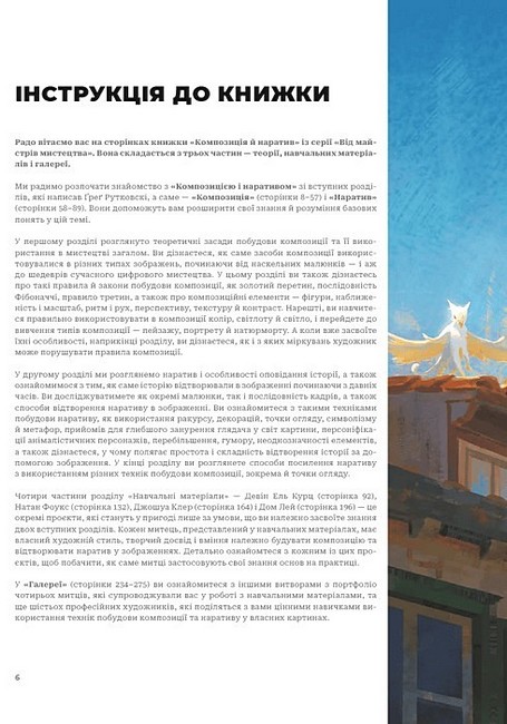 Книжка «Композиція і наратив» — друга в серії «Від майстрів мистецтва» після бестселера «Колір і світло». Вона складається з трьох розділів — теорії, навчальних матеріалів і галереї.