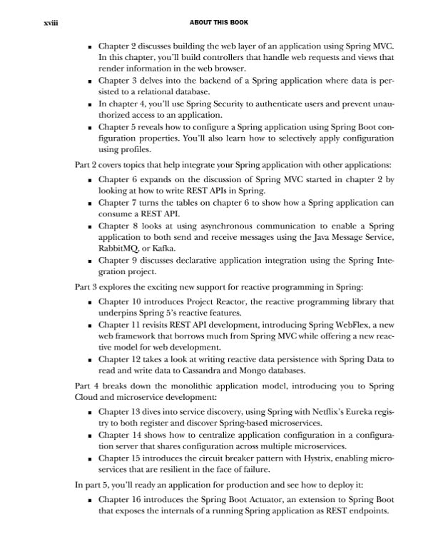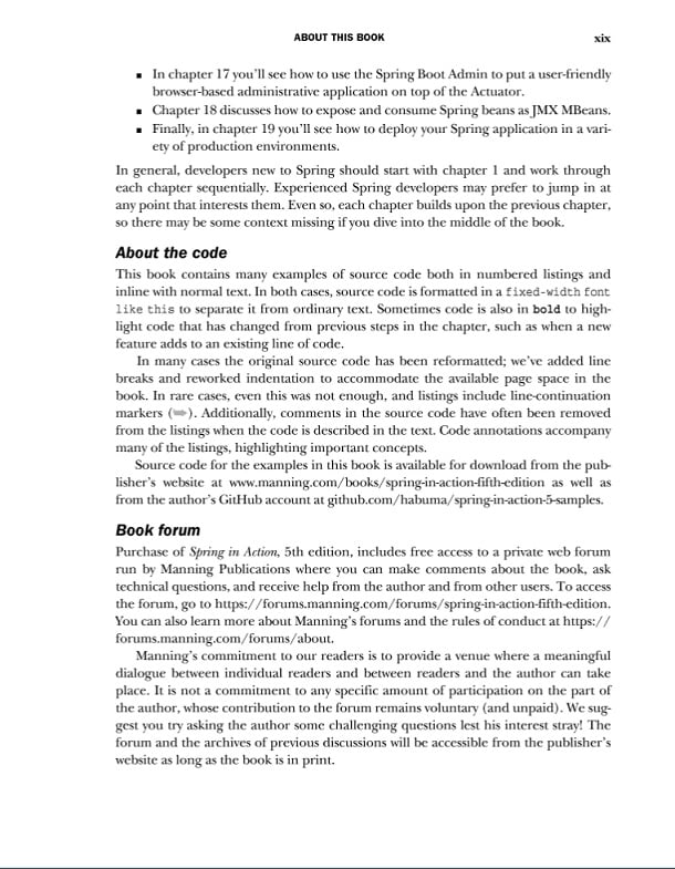 Spring in Action, 5th Edition is the fully updated revision of Manning's bestselling Spring in Action. This new edition includes all Spring 5.0 updates, along with new examples on reactive programming, Spring WebFlux, and microservices. You'll also find the latest Spring best practices, including Spring Boot for application setup and configuration.
