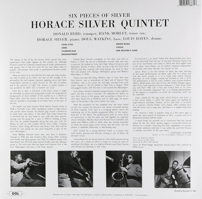 6 Pieces of Silver is an album by the Horace Silver Quintet, recorded on November 10, 1956 and released on Blue Note later that year. The quintet features brass section Donald Byrd and Hank Mobley and rhythm section Doug Watkins and Louis Hayes.