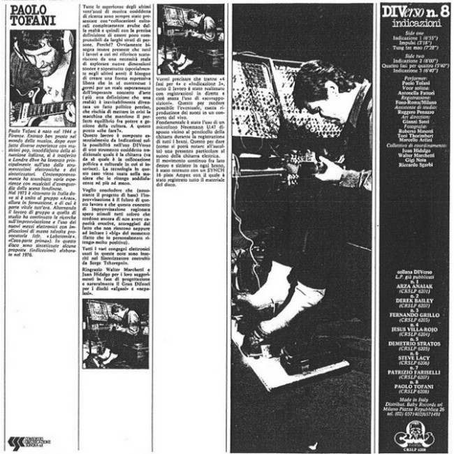 Paolo Tofani is guitar player and member of the Italian prog rock cult band Area (6) (1973 – 1979). Also member of Duo Darsan t/w Saveria Savidya Shukantala alias Shukantala Devi. Born January 19, 1944. Owner of the Krsna Vision label.