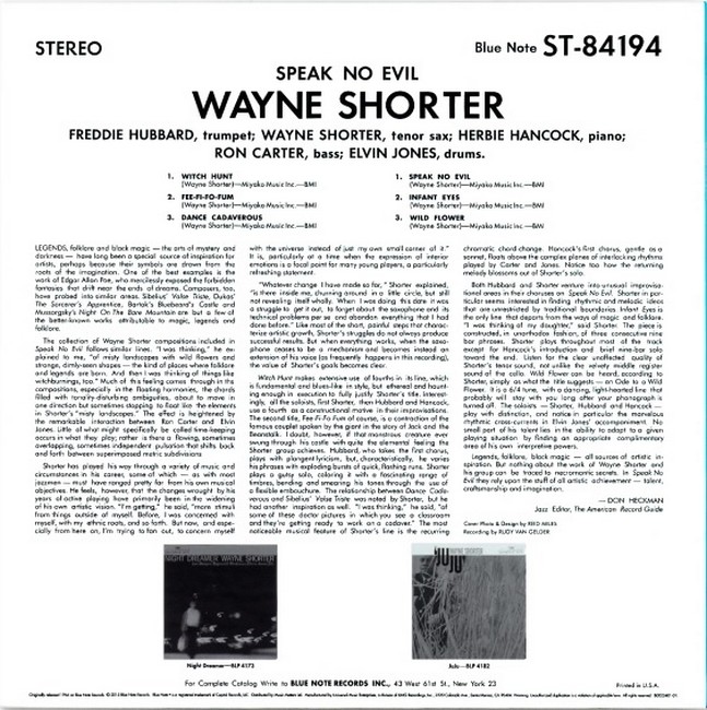 Speak No Evil is the sixth album by Wayne Shorter. It was released in June 1966 by Blue Note Records. The music combines elements of hard bop and modal jazz, and features Shorter on tenor saxophone, trumpeter Freddie Hubbard, pianist Herbie Hancock, bassist Ron Carter and drummer Elvin Jones. The cover photo is of Shorter's first wife, Teruko (Irene) Nakagami, whom he met in 1961.