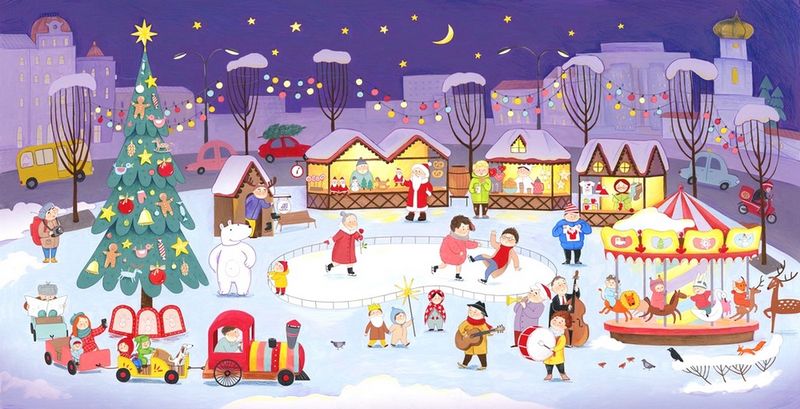 У «Новорічних канікулах» художниця Інна Руда зібрала 10 веселих історій про святкові розваги та події в зимовому місті. На кожній сторінці вирує життя: ось-ось впаде на ковзанці закоханий хлопчина, малюк з’їсть у кав’ярні торт з вітрини, Дід Мороз причепить на ялинку гірлянду, мама підхопить на пательню млинець, який вправно підкинула у повітря, а потім зробить селфі в дитячому поїзді. Про кожну ілюстрацію щоразу можна вигадувати свіжу історію, закручувати нові сюжети, помічати нові деталі та відшукувати загублені речі: чи то повітряну кульку малюка чи рукавички поважного чолов’яги. Це справжнє сімейне видання, яке покращить настрій, захопить і об’єднає дитину й батьків.