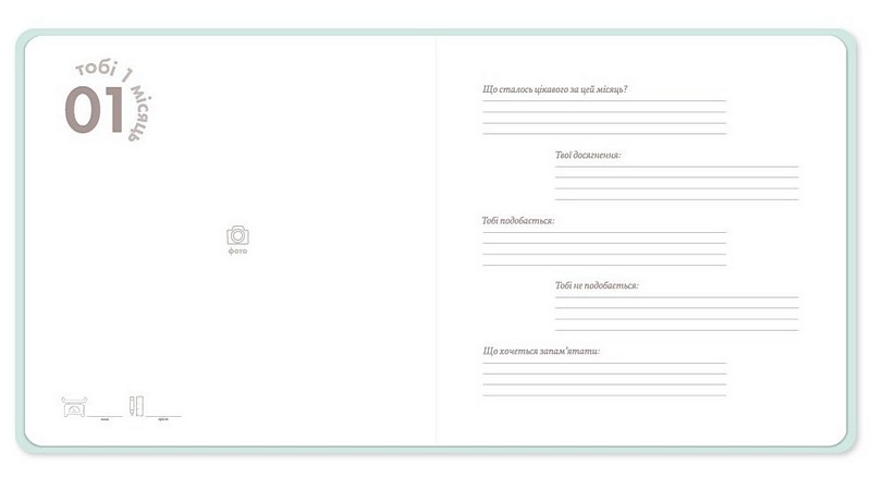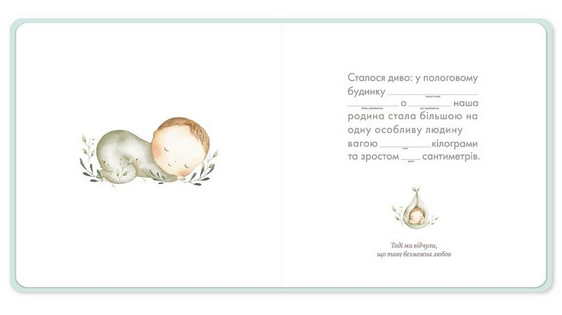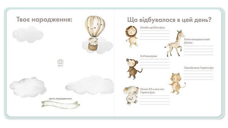 А також сторінку для запису інформації про те, що відбувалося в день народження дитинки (треба буде записати навіть ціну хліба та пісню, яка була ТОП 1 в українських пісенних чартах). Уявляєте, як потім те все переглядати? Цілковите задоволення.