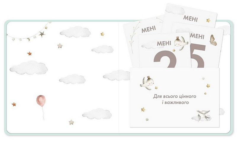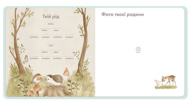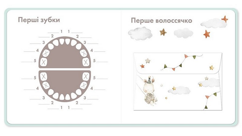 Ось, що ще ви знайдете в фотоальбомі: генеалогічне дерево, конверт для волоссячка, карту для зображення перших зубок та 12 карток — по одній на кожен місяць — для того, аби відстежувати ріст дитини.