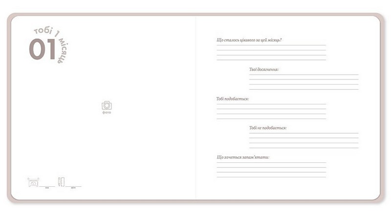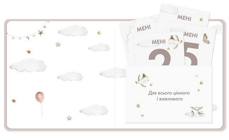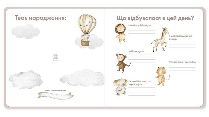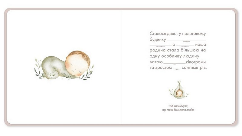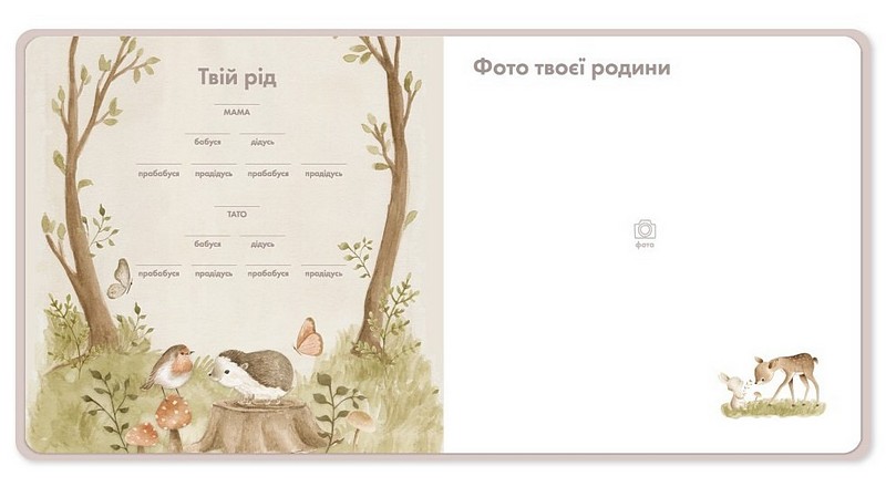 Ось, що ще ви знайдете в фотоальбомі: генеалогічне дерево, конверт для волоссячка, карту для зображення перших зубок та 12 карток — по одній на кожен місяць — для того, аби відстежувати ріст дитини. А також сторінку для запису інформації про те, що відбувалося в день народження дитинки (треба буде записати навіть ціну хліба та пісню, яка була ТОП 1 в українських пісенних чартах). Уявляєте, як потім те все переглядати? Цілковите задоволення.