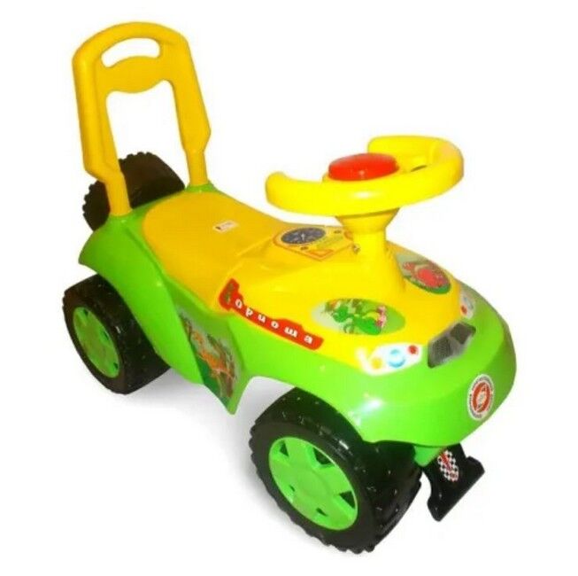 Машинка-каталка виготовлена з міцного пластику, що витримує значні навантаження. При ударі він не б’ється, не ламається, завжди знаходиться в акуратному стані. Фарба, використана при виготовленні каталки, не містить в своєму складі шкідливих компонентів, здатних викликати алергію або подразнення шкіри. Кермо та спинка сидіння можуть зніматися. Дана модель призначена для дітей від 3 років і витримує вагу до 30 кг. Машина виконана в яскравих кольорах, тому подобається як хлопчикам, так і дівчаткам. Кермо з клаксоном, так само за допомогою нього направляються два передніх колеса. Знімну ручку-спинку дуже зручно використовувати для перенесення машинки, а малюк може завжди на неї спертися. Під сидінням передбачено місце для іграшок або будь-яких дрібниць.