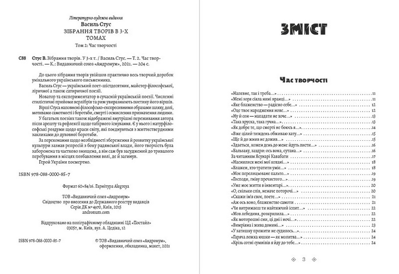 До цього зібрання творів увійшов практично весь творчий доробок унікального українського письменника. Василь Стус — український поет-шістдесятник, майстер філософської, ліричної, а також сатиричної поезії. Новатор та експериментатор в сучасній українській поезії. Численні стилістичні прийоми верлібрів та рим увиразнюють поетику його віршів.