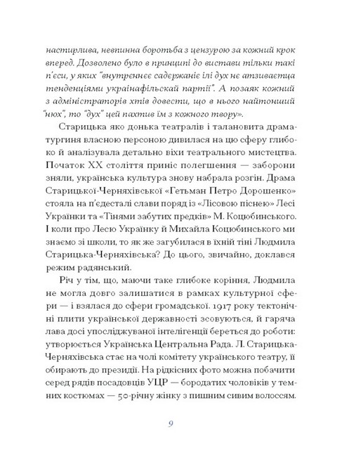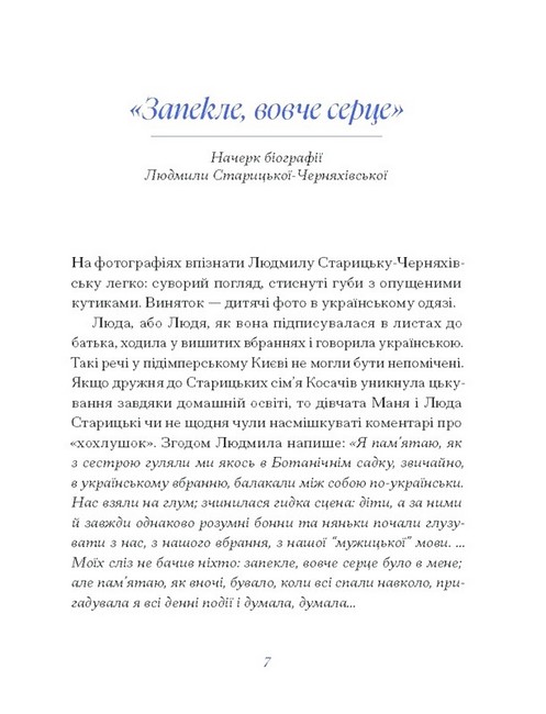 Зі школи нам відомі імена Михайла Старицького — корифея українського театру, Лесі Українки — «доньки Прометея». А донька першого, близька подруга другої з самого дитинства — Людмила Старицька-Черняхівська — постать нам незнайома. Вона все життя стояла в тіні тих, про кого дбала, а проте творила і працювала не менше, аніж вони. Її тексти і досі в тіні історії, її спогади досі мало хто чув. Пора пролити на них світло.