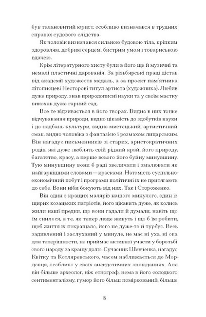 Олекса Стороженко відомий насамперед веселими оповіданнями про чортів і «прикрих баб», та справжню любов він плекав саме до історичної минувшини. Мандруючи у службових справах, письменник полюбляв знайти старожила і розпитати його про колишні часи, — нерідко це виливалося в унікальні історії. Проза Стороженка просякнута духом козаччини й тугою за безповоротно втраченим минулим. Поряд із замальовками-гуморесками письменник фіксує на папері загублені дні слави запорожців і гайдамаків, збирає народні легенди й бувальщини, записує фольклор. Крім того, Стороженко мав на меті створити «українського Фауста» в образі легендарного Марка Пекельного, що мандрує на межі між цим і тим світом. Якби не передчасна смерть автора — хтозна, чи не став би цей твір поряд з Енеїдою і Чорною радою. Наслідуючи приклад письменника, можемо й ми поринути в минуле, збережене хіба на сторінках книжок, і оживити його, як робив це Олекса Стороженко, створюючи «Споминки про Микиту Леонтійовича Коржа», «Дороша», «Марка Проклятого» та інші неповторні твори.