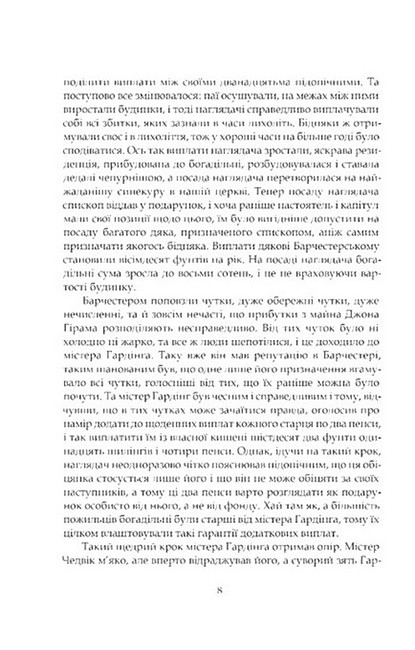 Перший роман барсетширського циклу відкриває двері в провінційне містечко, де церковні посади, доброчинні фонди й людські амбіції переплітаються міцніше за соборні арки. Скромний містер Гардинг очолює богадільню для літніх чоловіків і раптом опиняється в центрі гучного скандалу: чи справедливо він отримує свою платню? Чутки ростуть, преса загострює перо, друзі стають опонентами, і просте «бути порядним» виявляється найскладнішою місією. Без спойлерів: це роман про совість, любов і ціну публічної думки.