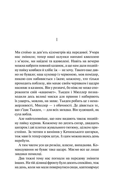 Це антивоєнний психологічний роман, класика XX століття. Підійде всім, хто цінує глибоку літературу, що не боїться показати жорстку правду. Ідеальна книга для тих, хто шукає чесну відповідь на питання: що відчуває людина на війні?