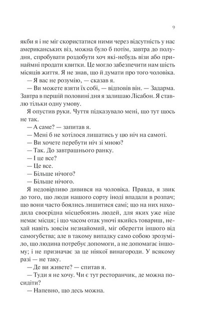 Ця книга — справжня ода любові, яка сильніша за війну. У ній є все: напруга втечі, біль втрат, романтична пристрасність і розпач від приреченості. «Ніч у Лісабоні» змушує замислитися над тим, що навіть у часи темряви людина може знайти світло у почуттях. Це один із найемоційніших і найчуттєвіших романів Ремарка.