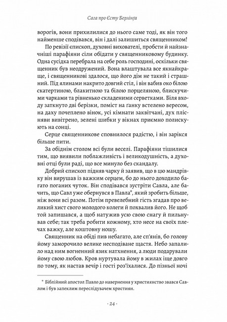 Роман Сельми Лаґерльоф «Сага про Єсту Берлінґа» — це казка, легенда й глибока психологічна драма одночасно. Авторка переносить нас у зимову Швецію XIX століття, у світ засніжених лісів, глибоких пристрастей і людських гріхів, що шукають прощення. Єста Берлінґ — колишній священник, який втратив усе, але отримав шанс повернути себе через любов, шляхетність і віру.