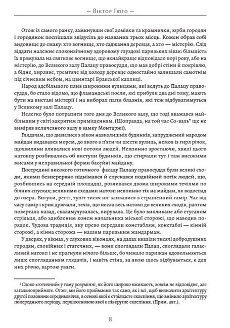 Віктор Гюго — майстер створення світу, у якому архітектура, люди й ідеї переплітаються в єдину симфонію. Його роман — це водночас гімн красі та протест проти несправедливості. Він змушує замислитись про людяність, про гріх і спокуту, про те, як тонка грань відділяє любов від одержимості.