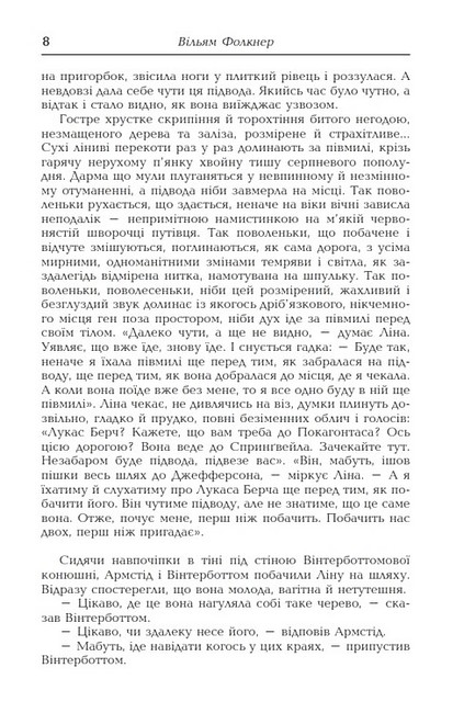 «Світло в серпні» Вільяма Фолкнера – це книга, яка захоплює з перших сторінок своєю інтенсивністю та психологічною глибиною. Роман переносить читача у південні штати США, де зустрічаються трагедії, надії та внутрішні конфлікти персонажів. Кожен герой переживає власну боротьбу, а автор майстерно малює світ, де зовнішня реальність віддзеркалює внутрішній стан людини. Ця книга не просто історія – це занурення у складні, протирічливі шляхи людських почуттів і рішень.