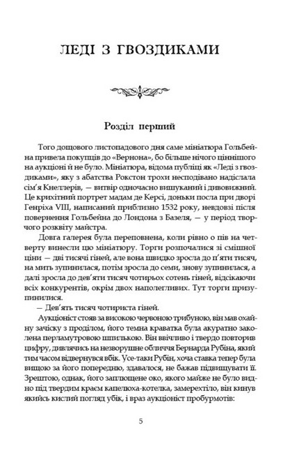 Головна героїня роману «Леді з гвоздиками» Кетрін Лорімер – успішна і багата жінка, власниця антикварного магазину. Вона опікується своєю племінницею Ненсі, яка прагне за будь-яку ціну стати великою актрисою. Кетрін і Ненсі несподівано виявляють, що закохані в одного чоловіка. Про подальший розвиток подій і всі перипетії з мініатюрою Гольбейна майстерно описано в романі.