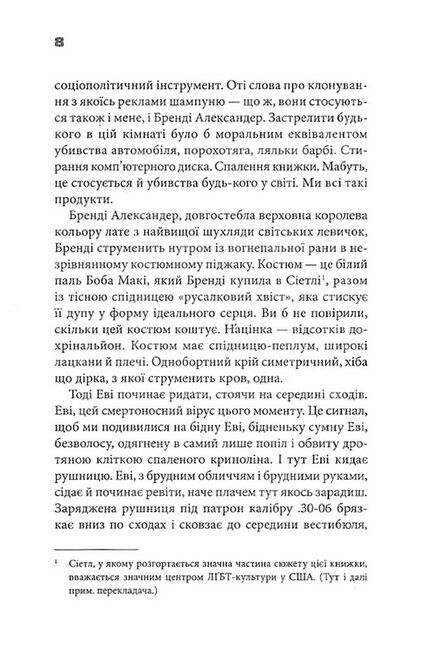 Вона була тою, якій озираються услід. Тою, про яку кажуть: «Ця сучка вхопила Бога за бороду». Красуня-фотомодель Шеннон Макфарленд мала все. Мазунчик-хлопець, блискуча кар’єра, вірні друзі. А потім… пуф! Постріл із пістолета в самісіньке гарне личко. Катастрофа, трагедія, шок… Шеннон перетворюється на потвору. Тепер вона ховається від людей і разом із колишнім хлопцем та найліпшою подругою займається грабунками та аферами. Завдяки цьому Шеннон завжди має доступ до наркотиків та сильних знеболювальних. Але вічно так тривати не може. Шеннон втомилася від невидимості. І жадає помсти. Утім, для цього доведеться стерти своє минуле. І - стерти саму себе…