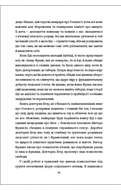 «Вибір. Прийняти можливе» — це не просто мемуари. Це глибока, чесна розповідь жінки, яка вижила в Аушвіці, втратила все, але знайшла сили жити далі. Едіт Єва Егер, світова зірка психології, ділиться не лише своєю особистою історією, а й досвідом допомоги іншим. Кожна сторінка — це виклик, запитання до читача і тихий заклик: обирай не страх, а свободу. Не минуле, а теперішнє. Не роль жертви, а силу жити.
