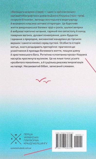 «Волоцюги дгарми» (1958) — один із найзнаковіших напівавтобіографічних романів Джека Керуака (1922—1969), «короля бітників», легенди мистецького андеграунду й визнаного класика світової літератури. Це бурхливе життя американської богеми 1950-х років, шалені вечірки й вибухові поетичні читання, гарячий пил автостопу й холод товарних вагонів, духовні поневіряння, дзен-буддизм і єднання з природою, виснажливі мандрівки до гірських вершин і самотні ночівлі серед пустелі. Особиста історія митця, якого роздирають протиріччя: прагнення до усамітнення й принади богемного життя, пошуки дзену й християнського бога. Ритмічна «спонтанна проза» Керуака наскрізь просякнута музикою. Це не лише голос усього «розбитого покоління», а й суцільна джазова імпровізація на папері. Несамовитий бібоп, записаний словами.