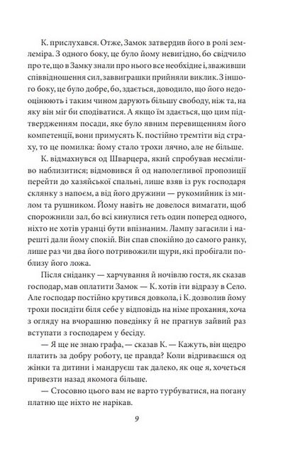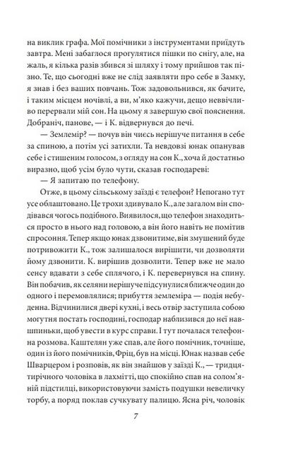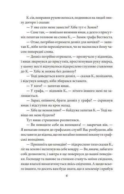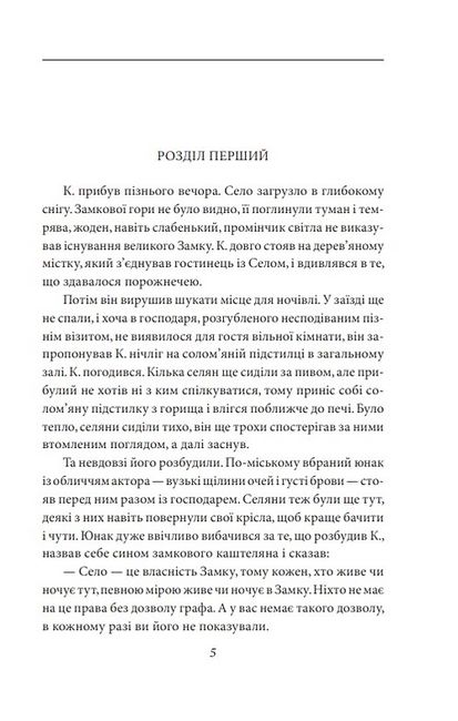 «Замок» — останній незавершений і найзагадковіший роман Франца Кафки. У центрі роману, як майже в усіх творах письменника, — втаємничені, алогічні, незбагненні взаємини людини зі світом, з системою, з владою, з іншими людьми. Головний герой К. шість днів блукає стежками зимового Села, намагаючись знайти дорогу до Замку. Історія героя нагадує перипетії долі самого автора і так само трагічно передає самотність і безпорадність людини в її протистоянні жорстокості й абсурдності життя.