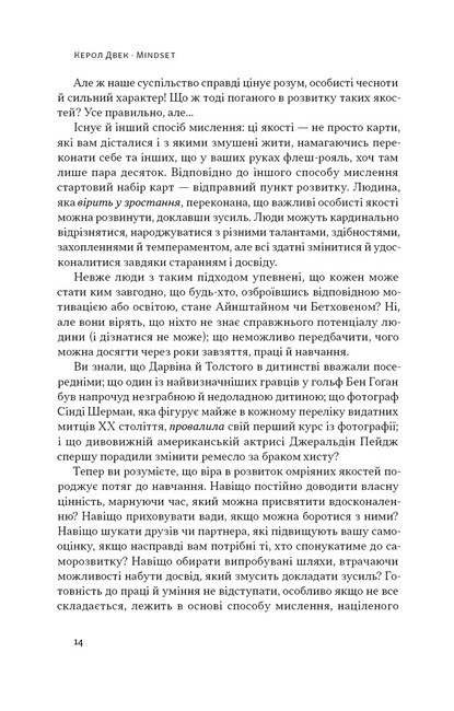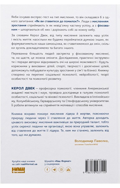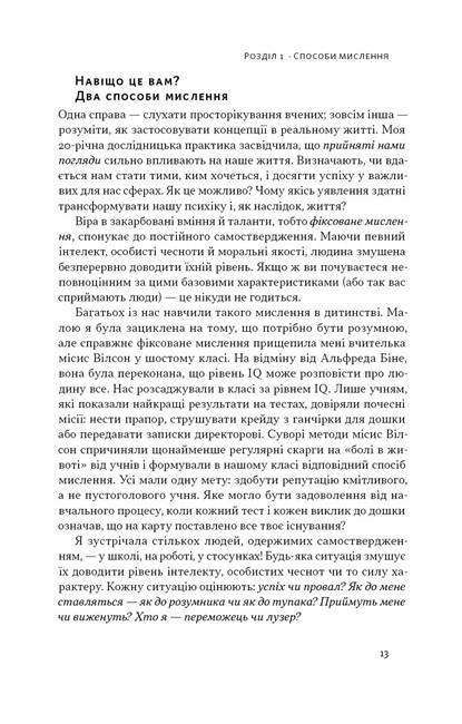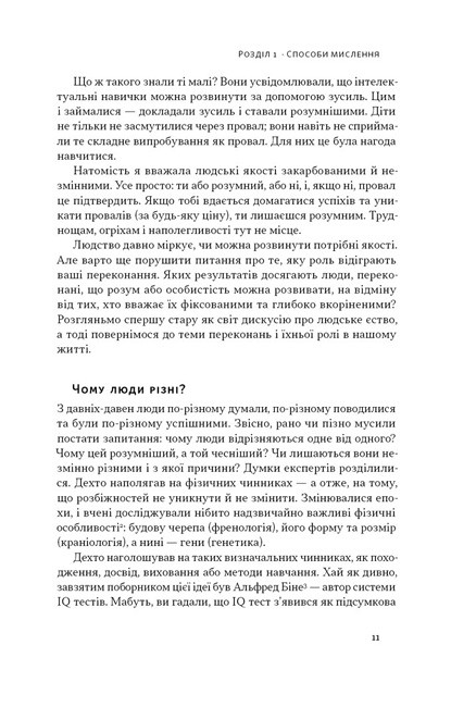 Протягом багатьох років Керол Двек досліджувала силу людських переконань і їхній вплив на наше життя. Намагаючись з’ясувати, чи є талант запорукою успіху, завдяки чому ми досягаємо бажаного і який рецепт розв’язання будь-яких проблем, вона зробила революційне відкриття. Успішність у навчанні й роботі, бізнесі та спорті, мистецький хист і взагалі кожна сфера людського життя можуть змінюватися залежно від того, що саме ми думаємо про власні можливості й таланти. Наші вміння не є сталими, і лише старанність та наполеглива праця здатні призвести до реальних досягнень.