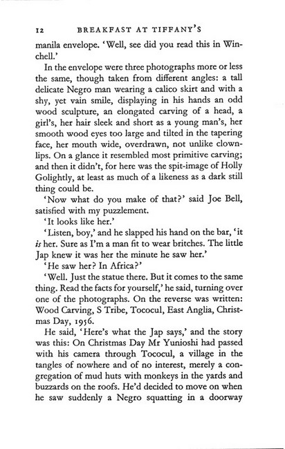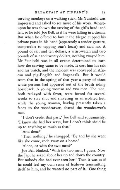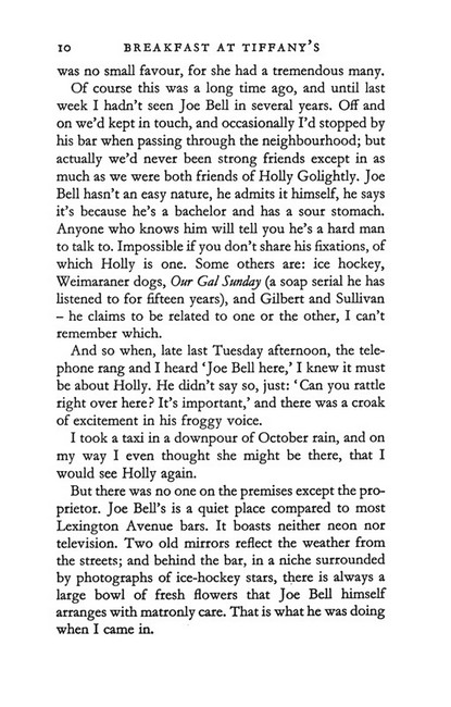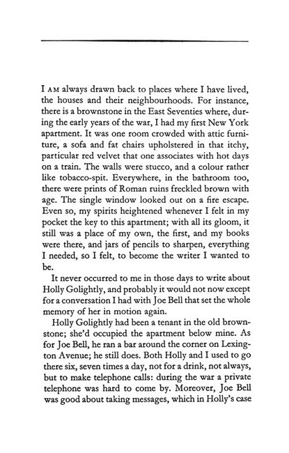 It's New York in the 1940s, where the martinis flow from cocktail hour till breakfast at Tiffany's. And nice girls don't, except, of course, for Holly Golightly: glittering socialite traveller, generally upwards, sometimes sideways and once in a while - down. Pursued by to Salvatore 'Sally' Tomato, the Mafia sugar-daddy doing life in Sing Sing and 'Rusty' Trawler, the blue-chinned, cuff-shooting millionaire man about women about town, Holly is a fragile eyeful of tawny hair and turned-up nose, a heart-breaker, a perplexer, a traveller, a tease. She is irrepressibly 'top banana in the shock deparment', and one of the shining flowers of American fiction.
