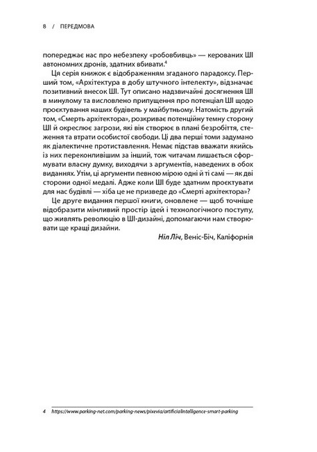 Уперше опублікована 2022 року, ця книжка Ніла Ліча зараз готується до другого видання, запланованого на 2025 рік. Але оновлена версія «Архітектури в добу штучного інтелекту» українською мовою побачить світ раніше — вже влітку 2024 року! Автор люб’язно запропонував урахувати в українському перекладі зміни, які він зробив для другого видання, «щоб точніше відобразити мінливий простір ідей і технологічного поступу, які живлять революцію в ШІ-дизайні».Ніл Ліч пише про застосування штучного інтелекту в архітектурі та «місто-мозок» майбутнього в дуже широкому контексті — після стислого огляду історії розвитку ШІ він ділиться міркуваннями на радше філософські теми, як-от здатність ШІ до творчості чи переосмислення мистецтва і взагалі процесів людського мислення в дзеркалі ШІ. Утім, йому йдеться також про багато цілком практичних речей — від проблем авторського права до конкретних програм, що їх уже сьогодні з різною метою використовують архітектори. Крім украй насиченого інформативно тексту, ця книжка також забезпечить Вам величезний список до читання й безліч лінків для подальших розвідок: у ній приблизно сімсот приміток.Але й це ще не все — Ніл Ліч працює над другою книгою, що має стати продовженням і діалектичною протилежністю першої. Цитуємо автора: «Ця серія книжок є відображенням згаданого парадоксу. Перший том, “Архітектура в добу штучного інтелекту”, відзначає позитивний внесок ШІ. Тут описано надзвичайні досягнення ШІ в минулому та висловлено припущення про потенціал ШІ щодо проєктування наших будівель у майбутньому. Натомість другий том, “Смерть архітектора”, розкриває потенційну темну сторону ШІ й окреслює загрози, які він створює в плані безробіття, стеження та втрати особистої свободи. Ці два перші томи задумано як діалектичне протиставлення. Немає підстав вважати якийсь із них переконливішим за інший, тож читачам лишається сформувати власну думку, виходячи з аргументів, наведених в обох виданнях. Утім, ці аргументи певною мірою одні й ті самі — як дві сторони одної медалі. Адже коли ШІ буде здатним проєктувати для нас будівлі — хіба це не призведе до “Смерті архітектора”?».