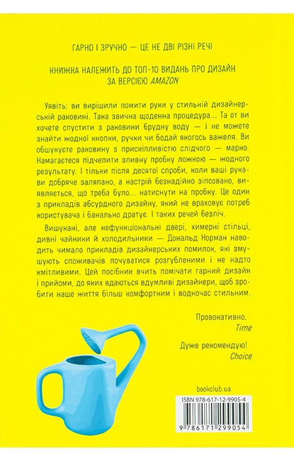 Уявіть: ви вирішили помити руки у стильній дизайнерській раковині. Така звична щоденна процедура... Та от ви хочете спустити з раковини брудну воду і не можете знайти жодної кнопки, ручки чи бодай якогось важеля. Ви обшукуєте раковину з прискіпливістю слідчого — марно. Намагаєтеся підчепити зливну пробку ложкою — жодного результату. І тільки після десятої спроби, коли ваші рукави добряче заляпані, а настрій безнадійно зіпсований, виявляється, що треба було… натиснути на пробку. Це один з прикладів абсурдного дизайну, який не враховує потреб користувача і банально дратує. І таких речей безліч. Вишукані, але нефункціональні двері, химерні стільці, дивні чайники й холодильники — Дональд Норман наводить чимало прикладів дизайнерських помилок, які змушують споживачів почуватися розгубленими і не надто кмітливими. Цей посібник вчить помічати гарний дизайн і прийоми, до яких вдаються вдумливі дизайнери, щоб зробити наше життя більш комфортним і водночас стильним.