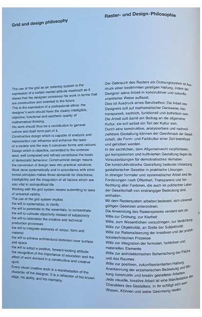 The development of organisational systems in visual communication was the service and the accomplishment of the representatives of simple and functional typography and graphic design. In the 1920s in Europe, works already arose in the areas of typography, graphic design and photography with objectified conception and rigid composition. In 1961 a brief presentation of the grid with text and illustrations appeared for the first time in an earlier book by the author. Articles published mainly in trade journals then followed.