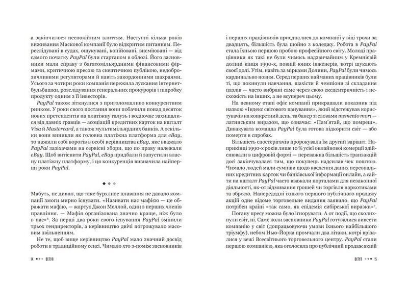 Ілон Маск, Емі Роу Клемент, Пітер Тіль, Джулі Андерсон, Макс Левчин — імена, які бентежать нашу уяву. Колись ці люди були невідомими творцями пересічної компанії, яка проводила онлайн-платежі, а сьогодні їх вважають одними з найвпливовіших у технологічній галузі. Після створення PayPal вони фінансували та консультували провідні компанії світу: Tesla, Facebook, YouTube, SpaceX, Yelp, Palantir, LinkedIn тощо.