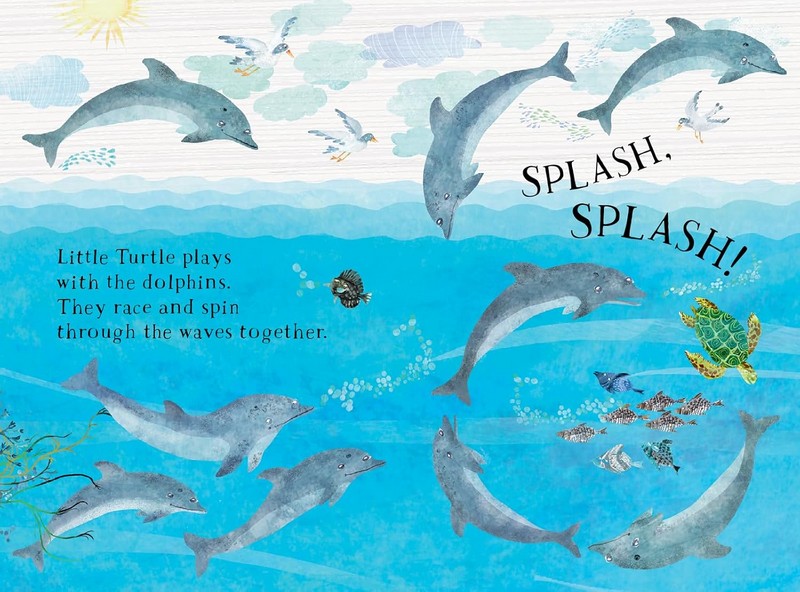 Ця товста книжка з чудовими ілюстраціями Юваля Зоммера, безліччю істот, яких потрібно розпізнати, та веселими ономатопеями, які можна прочитати вголос, ідеально підійде для будь-якої дитини, яка любить море. Разом із Черепахою поплавайте по океану і познайомтеся з десятьма видами морських мешканців, від летючих риб до величезного кита. Книжка закінчується заспокійливою сценою, що ідеально підходить для читання перед сном.