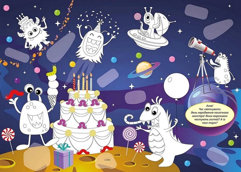 Який він — триокий монстр? А яка найближча до нашої галактика? Може, на її зорях мешкають космічні монстри? Тоді чим вони частують гостей на день народження? Запропонуйте дитині вигадати власні історії про кумедних чудовиськ, придумати їм імена. Книжка з наліпками й розмальовками пропонує маленьким читачам творити, радіти й фантазувати!