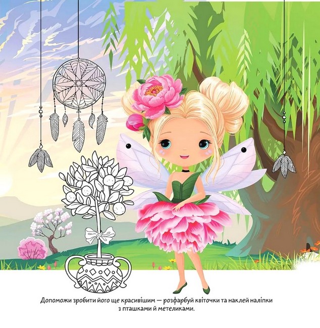 Квіткові феї люблять ходити одна до одної в гості, влаштовувати бали, пікніки. Допоможи їм: прикрась їхні сукні, розфарбуй будиночки. Усього лише за допомогою олівців і наліпок ти зможеш створити свій яскравий світ фей. А вигадуючи історії про пригоди подружок, ще більше розвинеш творче мислення та фантазію.