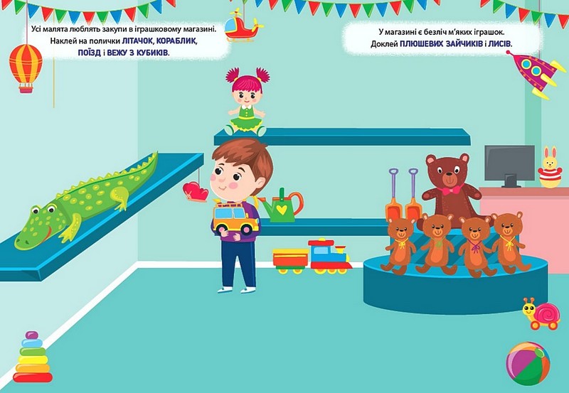 Книжка «Іграшки» пропонує малюкові погратися знайомими іграшками й дізнатися про нові. Великі наліпки, захопливі сюжети, зрозумілі завдання стануть запорукою цікавого дозвілля, а також сприятимуть розвитку дрібної моторики, мислення, мовлення та зорового сприйняття.
