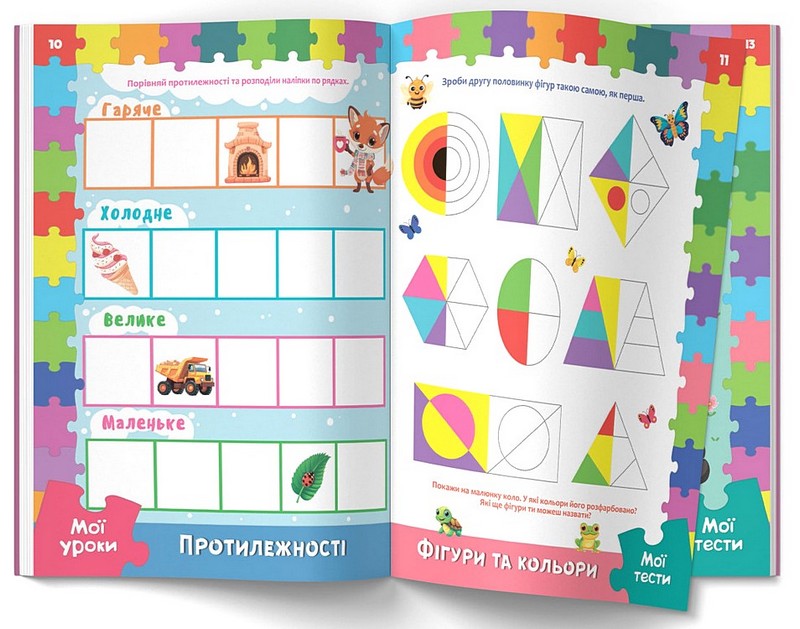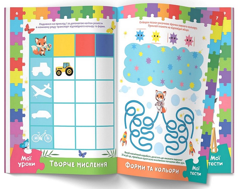 На сторінках нашої книги малюк знайде різноманітні творчі вправи та нескладні тести. У кожній книзі представлено різні комплекси завдань: з розвитку уяви, логіки та мовлення, для покращення координації, тренування уваги й пам’яті, написання літер і цифр, знайомства з кольорами та формами тощо. Дитина буде залюбки проходити лабіринти, клеїти наліпки й розфарбовувати малюнки, одночасно отримуючи нові знання та навички, що дійсно допоможе їй у підготовці до школи.