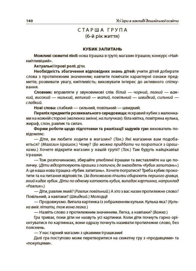 Новий базовий компонент Вихователю ЗДО Усі ігри в закладі дошкільної освіти Основа. Видання містить добірку понад 500 ігор для організації навчання та дозвілля дошкільників усіх вікових категорій за основними освітніми напрямами Базового компонента дошкільної освіти (2021): «Гра дитини», «Дитина в сенсорно-пізнавальному просторі», «Дитина в соціумі», «Мовлення дитини», «Дитина в природному довкіллі», «Особистість дитини». Дидактичні, рухливі, конструктивно-будівельні ігри та ігри-драматизації подано у зручній формі структурованих технологічних карт (можливі сюжетні лінії; актуальні ігрові ролі; необхідність збагачення відповідних знань та умінь дітей; перелік предметів розвивального середовища; форми роботи щодо підготовки та реалізації задумів гри).