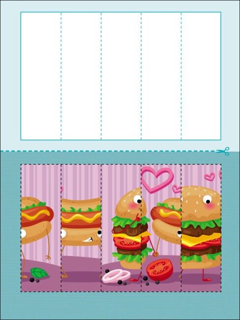 - комбінуємо різні лінії і напрямки у розрізанні. З вирізаних пазлів складаємо яскраві картинки. А на кожному звороті є бонус — картинка для розфарбовування.