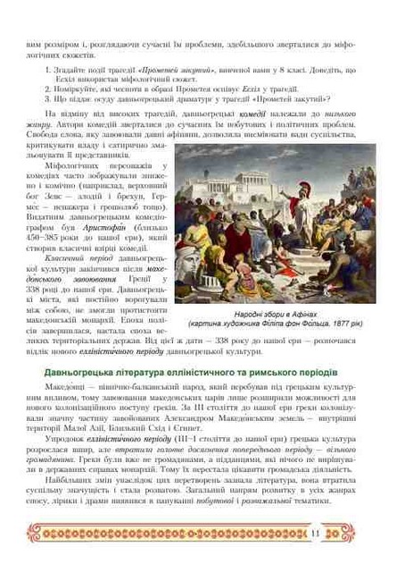 У підручнику подано статті, в яких розглянуто етапи розвитку літератури, схарактеризовано творчість письменників, проаналізовано конкретні художні твори та представлено матеріали з теорії літератури. Також запропоновано рубрики «Класна дошка», «Для тих, хто хоче знати більше», у яких стисло систематизуються основні положення вивченого та є додаткова цікава інформація про авторів, історію написання творів тощо. Підручник містить словничок літературознавчих термінів, словничок персоналій перекладачів і рубрику «Радимо прочитати». Для кращого засвоєння та повторення вивченого розроблено систему завдань і запитань.