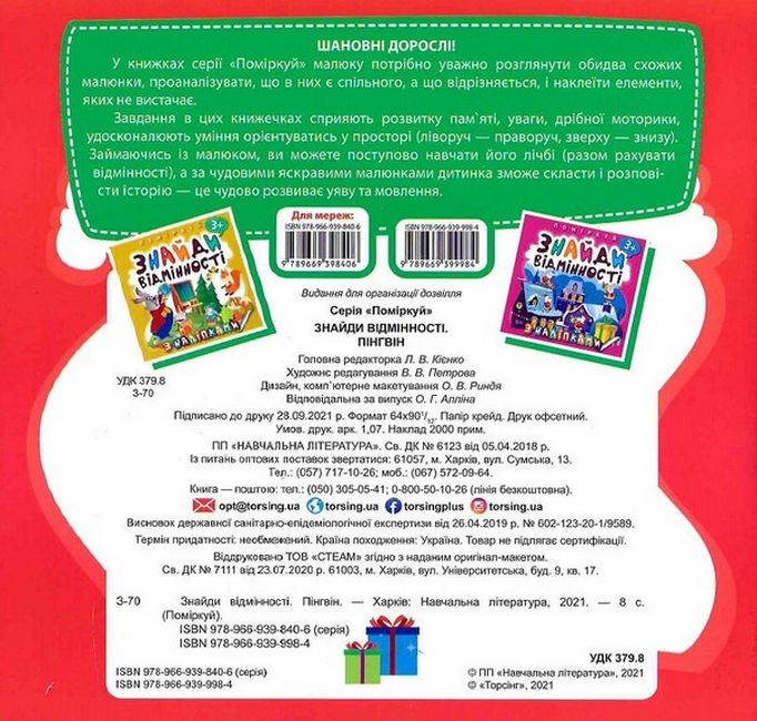 У книжечці малюку потрібно уважно розглянути обидва схожих малюнки, проаналізувати, що в них є спільного, а що відрізняється, і наклеїти елементи, яких не вистачає. Завдання цієї книжечки сприяють розвитку пам`яті, уваги, дрібної моторики, удосконалюють уміння орієнтуватись у просторі (ліворуч — праворуч, зверху — знизу). Займаючись із малюком, ви можете поступово навчати його лічбі (разом рахувати відмінності), а за чудовими яскравими малюнками дитинка зможе скласти і розповісти історію — це чудово розвиває уяву та мовлення.