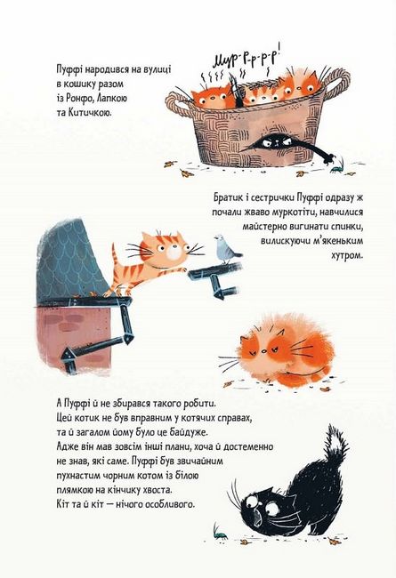 Чорний кіт Пуффі ходить містом і шукає, хто б його взяв... А тим часом відьмочка Брунільда готується до свого першого польоту на мітлі, та для цього їй бракує кота. Аж ось у її будинку з’являється Пуффі... А далі починаються справжні пригоди — шалені поради бабці, вітання від прапрадіда Скаженика, карколомний політ та ще багато кумедної всячини.