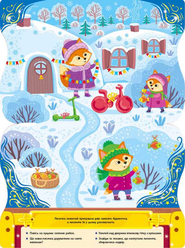 Підтримайте чарівну атмосферу гарним подарунком у вигляді незвичайної книжки-скриньки «Ялинкові прикраси». З перших сторінок маленькі читачі поринуть у казковий світ святкового оздоблення, різнобарвних гірлянд і мерехтливих вогників, який дитина доповнить наліпками. Виконуючи різноманітні завдання, малюк розвине фантазію, мислення, мовленнєві уміння та дрібну моторику пальців рук.