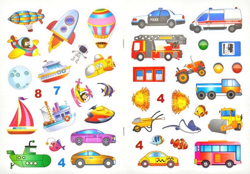 Наліпки для розвитку малюків від 3-х років познайомлять дитину з різними видами транспорту: автомобілем, повітряною кулею, пароплавом, літаком, космічним кораблем тощо.