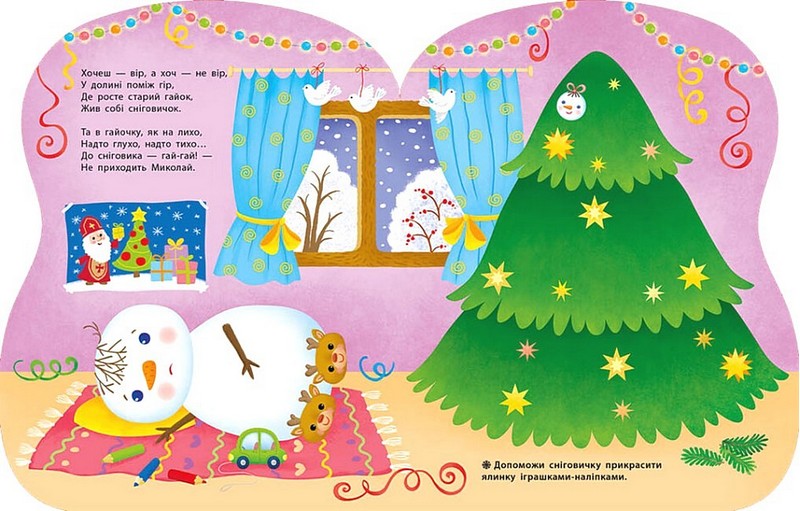 Серія «Наліпки для найменших» — це одночасно і книжка-іграшка у формі ялинки чи будиночка, сніговика чи різдвяної шкарпеточки, і веселе святкове дозвілля! У книжці на малюка чекає коротенька віршована історія та прості завдання з наліпками. Дорослий читає віршик і завдання, а малюк клеїть на сторінки великі, зручні наліпки. Книжки серії допоможуть розвивати мовлення, увагу, допитливість та дрібну моторику. У книжці «Сніговик» на вас чекає добра святкова історія про Сніговичка. Подаруйте собі й малюкові святковий настрій!