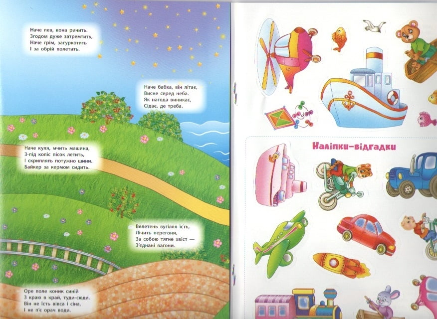 Це видання призначене для розвитку дрібної моторики, уваги, уяви та кмітливості малюків. Загадки у віршах спонукатимуть дитину шукати відповіді серед наліпок і клеїти їх до білі ілюстрованої панорамки.